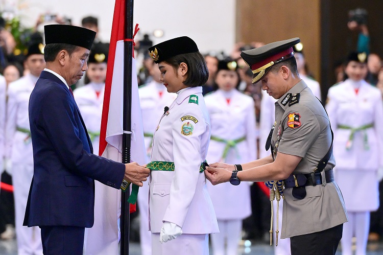 Selepas itu, Presiden Jokowi menyematkan lencana secara simbolis kepada pemimpin upacara sebagai tanda pengukuhan Paskibraka.