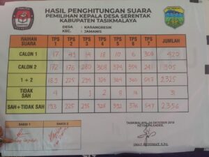 “Intinya kita sebelum asar telah menyelesaikan semua hajat demokrasi begitupun surat suara sudah dihitung dan ditanda tangani kedua saksi dari masing-masing calon serta semua saksi setuju atas hasil penghitungan,ini semua berkat kerjasama dan kekompakan seluruh panitia Pilkades dalam menjalankan tugasnya, “pungkas Imat Ruhimat,S.Pd.