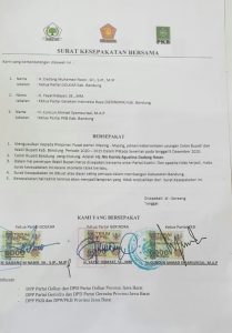 Ciparay (BR).- Surat Kesepakatan Bersama (SKB) antara Partai Golkar, Gerindra dan PKB Kabupaten Bandung, pasca ditetapkannya Cabup/Cawabup Partai Golkar Kurnia Agustina Dadang Naser dan Usman Sayogi pada 12 Juli lalu, menjadi viral diberbagai media.