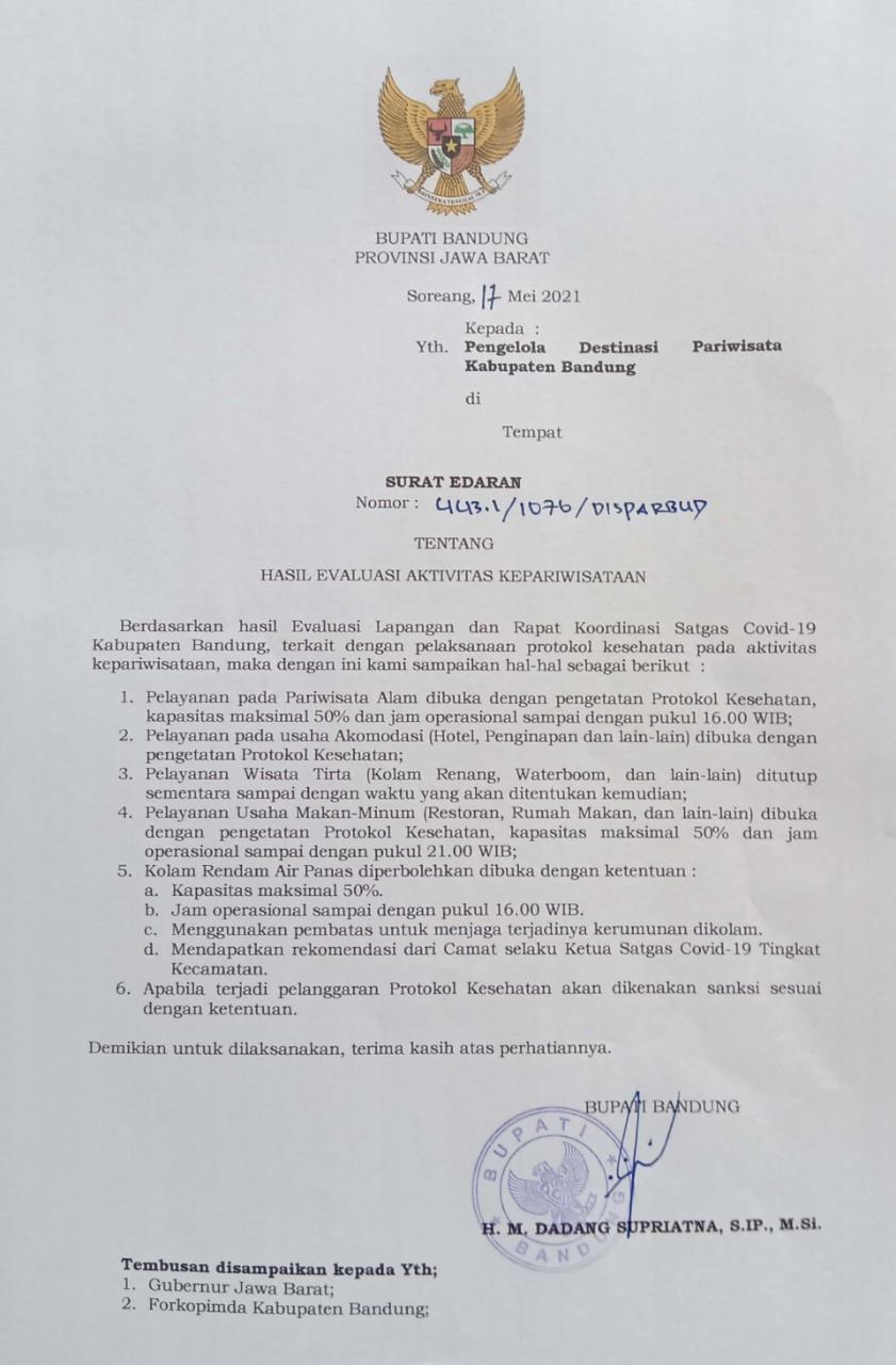 Hari ini melalui surat edaran Bupati Bandung Nomer 443.1/1076/Disparbud tertanggal 17 Mei 2021tentang hasil evaluasi Aktivitas kepariwisataan.
