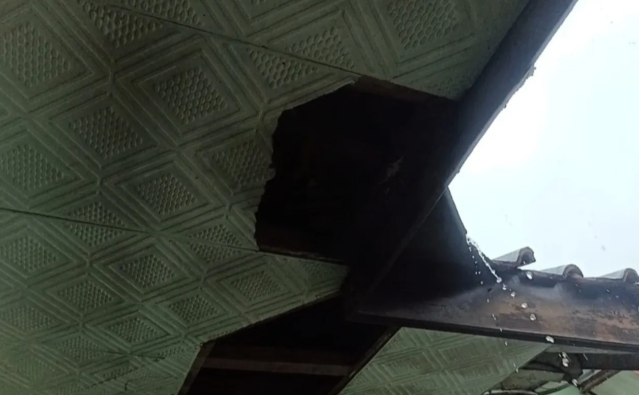 Di bagian depan sekolah misalnya, cat bangunan tampak kusam dan memudar. Selain itu, pada bagian atap plafon berbahan internit terlihat mengalami kebocoran di beberapa titik.