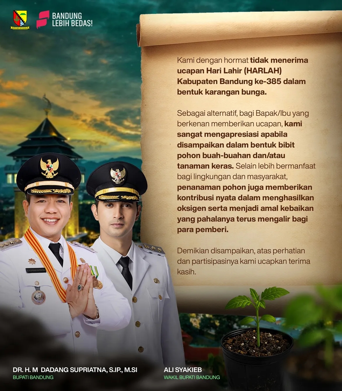 "Setelah kemarin kita putuskan untuk mengalihkan anggaran Hari Jadi Kabupaten Bandung ke-385 untuk penanganan bencana banjir, dengan hormat kami pun tidakĀ menerima ucapan Selamat Jadi Kabupaten Bandung dalam bentuk karangan bunga," imbuh KDS.